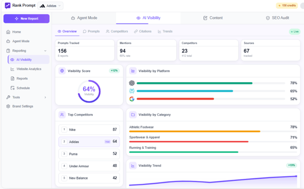 Rank Prompt offers affordable prompt visibility tracking with agency-focused features. Credit-based pricing ($49-149/mo for 150-1000 prompts) makes it practical for managing multiple brands.