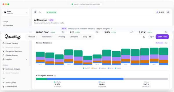 Qwairy excels in content gap analysis, identifying competitor citations and backlink opportunities. Starting at $79/mo, it focuses on content strategy for ai visibility improvement.