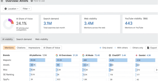 Ahrefs Brand Radar provides free AI visibility checks leveraging its massive backlink database for competitor tracking across ChatGPT and Perplexity. It offers a reliable foundation for teams already within the Ahrefs ecosystem.