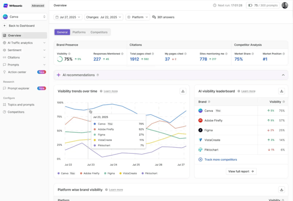 Writesonic merges AI content creation with basic ai visibility tracking, enabling bulk content generation optimized for citations through publishing workflows.